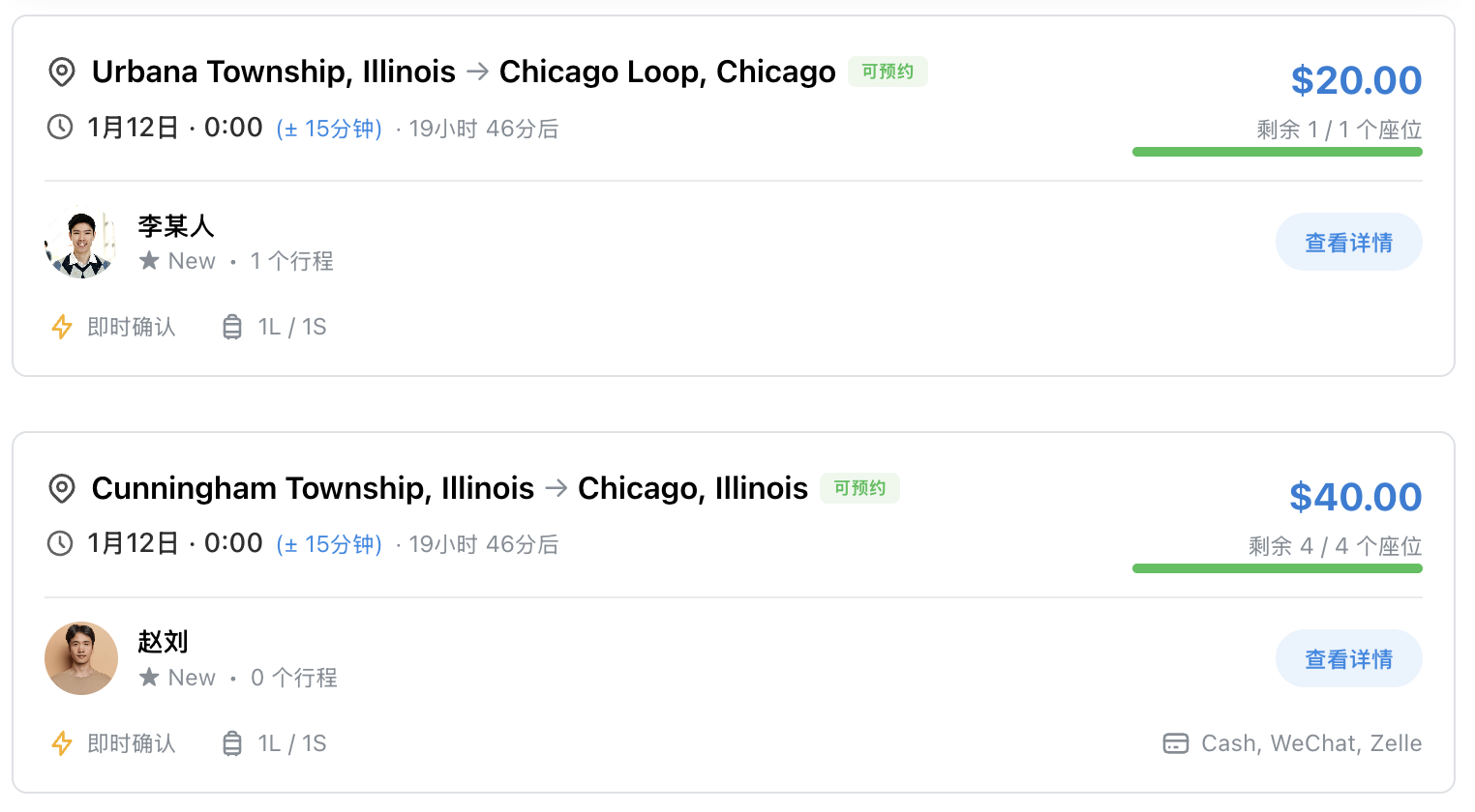 价格、时间、距离、行李空间、司机评分,一眼看全。 • 已验证的司机 • 明确的行程规则 • 座位情况提前展示