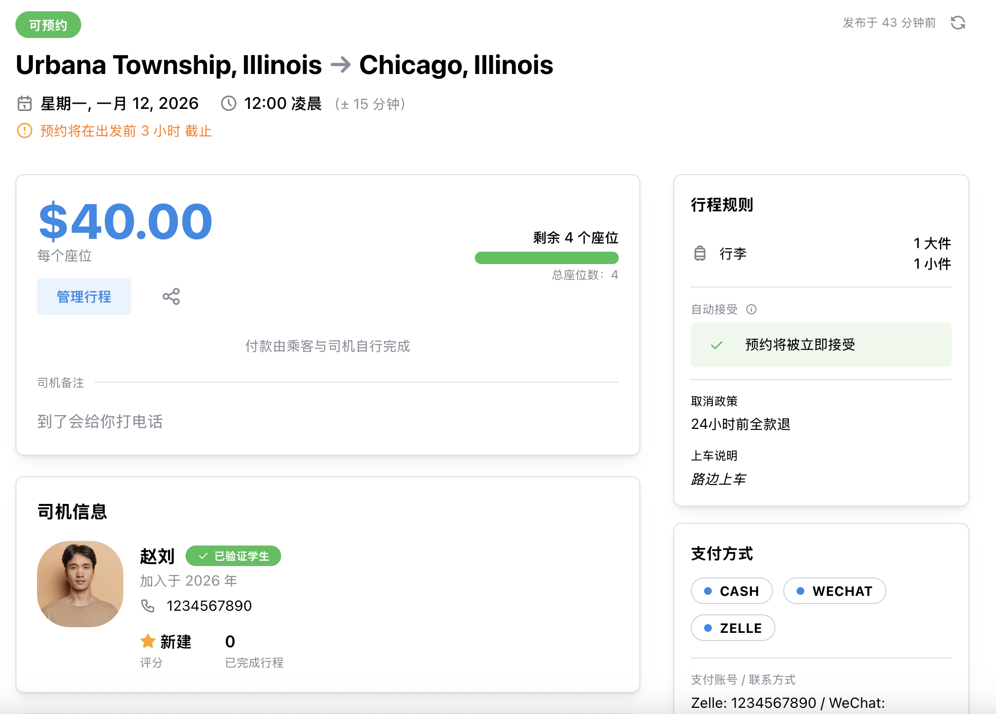 在一个页面中设置路线、时间、价格和偏好。 • 对公众安全的位置展示 • 行李与支付规则 • 自动通过或手动审批